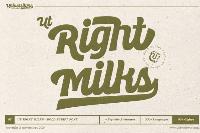 This font is the perfect solution for designers facing the problem of repetitive typography or limited creative control. Whether it’s for branding, marketing campaigns, or web design, UT Right Milks makes sure your designs stand out while maintaining readability. Additionally, its support for over 200 languages ensures global reach, resolving the challenge of finding a bold script that works across different markets and audiences.