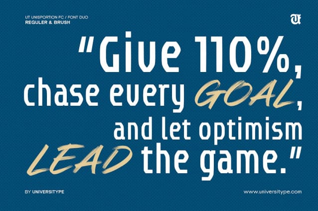 UT Unisportion FC Font Duo is a dashing font duo that packs a punch. Its captivating appeal lies in the fusion of dynamic athleticism and the classical elegance inherent in Buginese maritime architecture. The amalgamation births two distinct styles – the stalwart UT Unisportion FC Regular and the lively UT Unisportion FC Brush. These styles offer a unique visual vernacular, leaving an indelible print on every design they grace. A versatile font perfect for the designers and brands seeking personality ingrained in versatility, UT Unisportion FC provides a compelling edge to any project.