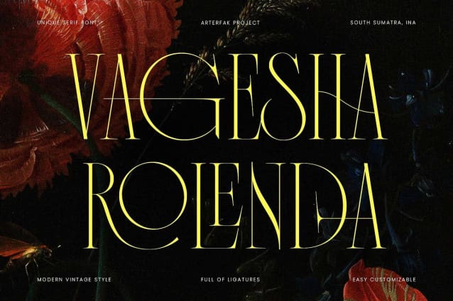 With over 100 ligatures, Vagesha Rolenda offers endless opportunities to explore unique typographic styles, adding depth and sophistication to your designs. It’s an excellent choice for logos, posters, wedding invitations, cards, branding, flyers, and more.