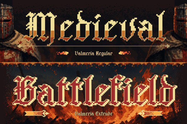 Valmeria Medival Pixel Font a unique typeface that blends the bold spirit of medieval blackletter with the retro charm of pixel art. This font is all about drama and sharp edges style, pixel perfect curves, and that old-school gothic vibe that feels straight out of a dark fantasy RPG. Whether you’re working on a pixel game, a vintage poster, or just wanna give your design some epic knight energy, Valmeria is here to rule. Comes in Regular and Extrude styles, so you can keep it clean or go extra bold with a striking 3D look. Plus, it’s packed with uppercase, lowercase, numbers, and symbols—ready to bring your medieval pixel dreams to life. If you’re into pixel art, gaming aesthetics, or just love fonts that stand out, Valmeria is the perfect weapon of choice.