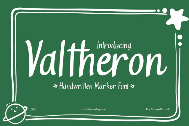 Valtheron Font is a playful and expressive handwritten marker font that captures the energy of casual doodles and authentic handwritten notes. With its slightly slanted strokes and smooth curves, Valtheron brings an approachable and cheerful personality to every project. Whether you’re creating a fun educational worksheet, a creative website header, or branding for a casual product, this font adds that human, hand-crafted charm. A Must-Have Font for Brand and Creative Content Creators Valtheron stands out with its ability to make your message feel personal and sincere — ideal for designs that aim to connect emotionally with their audience. Its balance between legibility and whimsy makes it versatile enough for both digital and print applications.