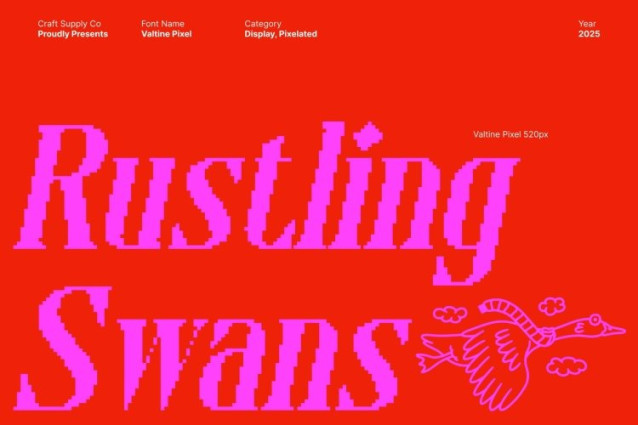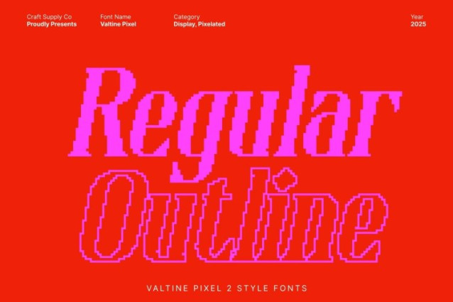 Valtine Pixel Font This is an aesthetic display font designed to embody modern elegance and youthful charm. Featuring soft curves paired with a trendy serif structure, this typeface delivers a stylish, contemporary appearance that feels right at home in today’s visual culture.
