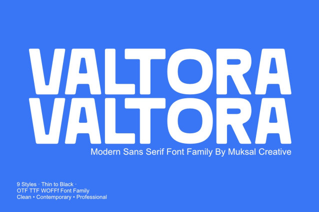 Valtora Font is a modern sans serif font family designed for clean, professional, and contemporary visual communication. With a complete set of 9 styles from Thin to Black, Valtora provides a flexible typographic system that works beautifully across branding, editorial design, UI/UX, and digital products. Its balanced proportions, clear letterforms, and neutral personality make Valtora highly versatile for both display and text usage. Whether you’re creating bold headlines, refined layouts, or sleek interfaces, Valtora delivers strong readability and a modern aesthetic that fits a wide range of creative projects. This type family is crafted for designers who need a reliable, minimalist sans serif with a premium feel—perfect for logos, websites, presentations, posters, social media, packaging, and corporate identity systems.