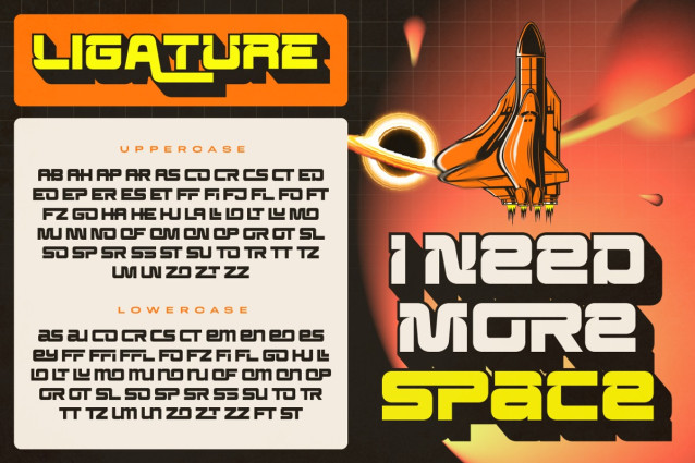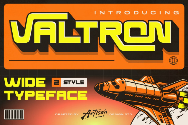 Valtron Font is a bold wide typeface inspired by retro-futuristic sci-fi visuals and space exploration aesthetics. With its strong geometric shapes, wide proportions, and sharp cuts, Valtron instantly delivers a powerful, futuristic vibe. This font comes with 2 styles: Regular and Extrude, allowing you to create depth, dimension, and eye-catching typography. It also includes ligatures and stylistic alternates, giving you more flexibility to customize your lettering and create unique logotypes or headlines. Valtron works best for sci-fi branding, futuristic logos, posters, game titles, space-themed designs, album covers, and bold display typography. Whether you want something loud, modern, or cosmic, Valtron is built to stand out.
