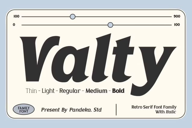 Valty offers five style families: Thin, Light, Regular, Medium, and Bold. It also features both Regular and Italic styles, with bold letterforms and playful curves.