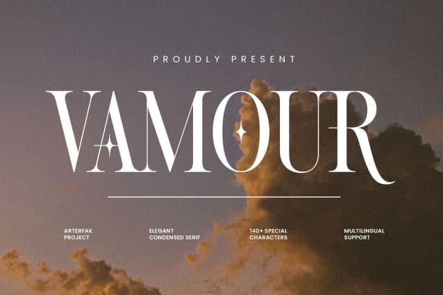 Vamour Font, a font that exudes elegance and luxury. With its condensed form and modern-classic design, it adds sophistication to any project. Equipped with stylistic alternates, ligatures, and multilingual support, Vamour is perfect for branding, posters, quotes, and more.