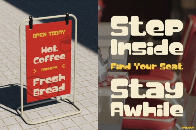 Vanjova Font bursts with bold personality and nostalgic charm, making it instantly eye-catching and memorable. From the very first look, this font delivers a strong retro vibe inspired by classic diners, coffee shops, and vintage storefront signage. Its chunky letterforms, rounded edges, and confident weight create a warm commercial rhythm that feels friendly, expressive, and highly readable. Moreover, VANJOVA balances playful energy with structure, which allows it to shine in both loud promotions and clean layouts. As a result, your message feels bold, approachable, and full of character.