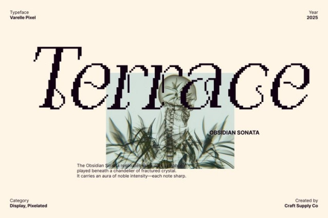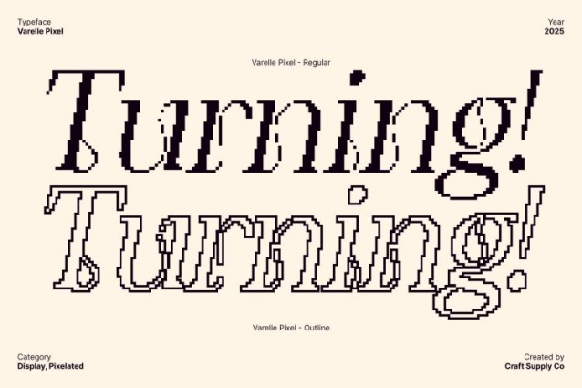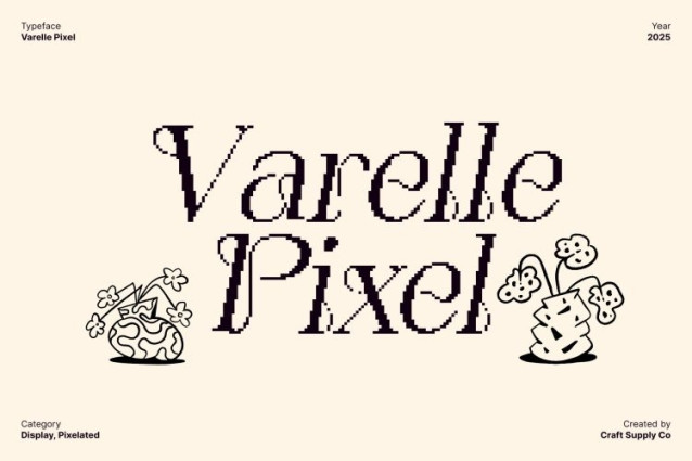 Varelle Pixel Font This is a modern serif font inspired by the flowing curves and decorative beauty of Art Nouveau design. Its organic letterforms and graceful contours create a sense of elegance and sophistication while maintaining a contemporary edge. This combination of classic artistry and modern styling makes it perfect for designers seeking refined yet trendy typography.
