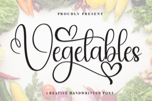 Vegetables Script Typeface is a charming handwritten font that exudes warmth and friendliness. With its smooth, flowing strokes and playful curves, it brings a sense of whimsy to invitations, packaging, and social media graphics. Spread joy and delight with the inviting charm of Vegetables.