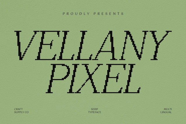 Vellany Pixel Font: Elegance with a Digital Edge Modern Serif with Pixel Precision This is a modern serif font that blends timeless elegance with a sharp, digital-inspired pixel style. Its clean, structured forms communicate refinement and professionalism, while the pixelated edge adds a contemporary twist that makes it stand out in any setting. Minimalist Yet Stylish Designed with simplicity in mind, Vellany Pixel carries a minimalist aesthetic that doesn’t sacrifice character. The subtle pixel effect introduces texture and personality, making it both stylish and distinctive, ideal for projects that need a balance of clarity and uniqueness. Sharp Edges for Distinctive Visuals The pixel styling sharpens each character, giving your designs a precise and modern look. This crisp detail makes this font perfect for display settings where text needs to leave a strong and lasting impression. Versatile for Editorial and Branding Use From editorial spreads and branding identities to creative layouts and posters, adapts seamlessly to diverse design applications. Its professional serif base paired with its digital edge ensures that your projects feel both sophisticated and fresh. Download Type Speciment: — What you get : – Vellany Pixel Regular – Vellany Pixel Outline Features : – Uppercase and lowercase characters – Numerals and Punctuation (OpenType Standard) – Accents (Supports Multilingual Characters) – PUA Encoding — You can use this typeface without needing any specialized software. — If you have any inquiries or need assistance, please feel free to contact us. We appreciate your support in enhancing your creative projects! Best regards, Craft Supply Co.