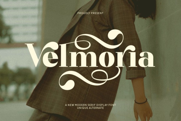 Velmoria Font, a new modern serif display font with unique alternates. The typeface is presented in a soft, off-white, set against a stylish, vintage-toned photograph of a person in a plaid blazer. The font’s highly decorative swashes and retro-chic 70s aesthetic are perfect for creating impactful branding, logos, and headlines.