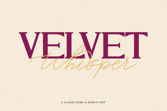 Velvet Whisper Font Duo: a sophisticated serif typeface coupled with a playful handwritten script. Embracing a fusion of modern elegance and whimsical charm, Velvet Whisper Font Duo delivers a touch of luxury and refinement to a variety of creative projects. Whether adorning websites, crafting contemporary logos, defining brand identities, sprinkling social media quotes, designing wedding stationery, or bringing any imaginative concept to life, VelvetWhisper Font Duo invites you to express your vision with grace and allure.