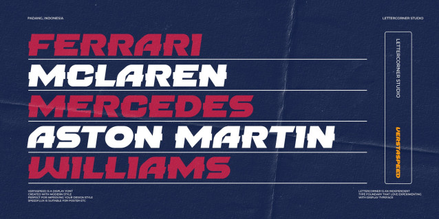 Verstaspeed Font isn’t only about speed-inspired letterforms — it’s a complete racing type system. With a wide set of alternates and ligatures, this font gives designers the freedom to create dynamic, fast-moving wordmarks that feel alive on the track.