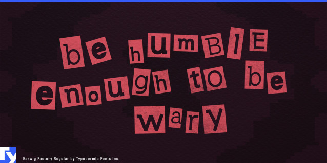 Very Earwig Factory Font is another scattering of jumbled cut-outs. For a more realistic feel, letters and numerals in OpenType-savvy programs are pseudorandomized. Color/texture layers can be created using the “letters” and “cards” styles. An additional “cards” layer can be offset to create a drop shadow effect. Most Latin-based European writing systems are supported, including the following languages.