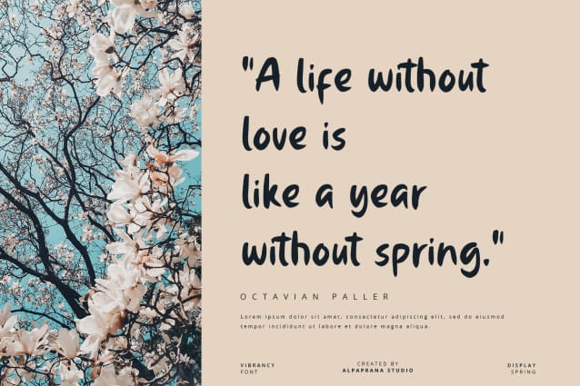Vibrancy Display Font is a display font with natural and modern feels. It will be perfectly used for Branding, Logo Design, Lettering, Logotype, Clothing, Poster, magazine, packaging, posters, shopping bags, t-shirts, book covers, photography, special events and other design project.