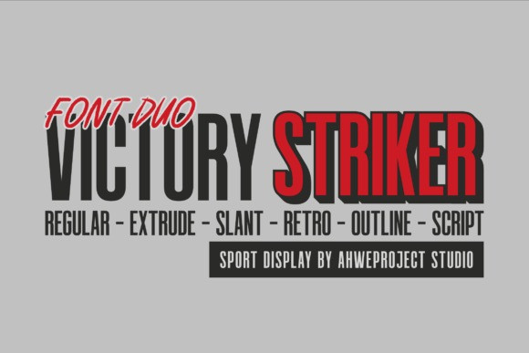 Victory Striker Font, a bold and dynamic sports display font duo designed to bring power and to your projects. Combining a strong, tall sans serif with a striking script, this font is perfect for sports branding, athletic team logos, esports, posters, and energetic headlines. With multiple styles including Regular, Extrude, Slant, Retro, Outline, and Script, Victory Striker gives you the flexibility to create eye-catching and competitive designs. Elevate your typography game with this adrenaline-pumping font duo!