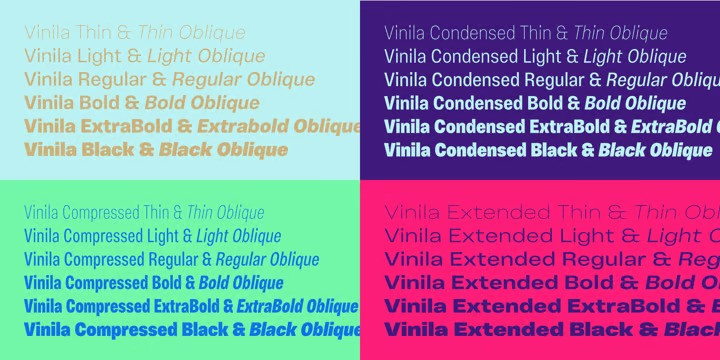 Vinila Sans Serif Font Family. Grotesques can answer a really wide variety of design problems and go from small sizes to large without missing a beat. Vinila is Flora de Carvalho’s take on the genre. The family’s multi-purpose intention comes from having 4 widths – from compressed to extended, each with 6 weights and obliques. Rhythm and music played an important part in the design of this font, which started off as the lettering for a Brazilian Music album. Its distinctiveness comes from having powerful ink traps that go from elegant and supple in the lighter styles to commanding and impactful in the heavier styles. A distinct rhythm is achieved, making it a strong face for editorial design, branding projects and so much more. Vinila is the ideal companion to expressive display faces, where it serves a supporting role with a marked presence. We use Vinila every day in our own brand identity. We’ve had some of the best designers use it and test it in many different environments, printed, digital, mobile and more (they really like it!). Also in the package, Vinila Variable is an experimental version of Vinila, where you can have a virtually infinite mix of weights, widths and slant, all from a single font file. Available when you license the complete family. Vinila pairs happily with our cheerful