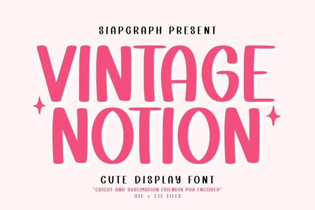 Vintage Notion Font is a cute and playful display font that blends a retro feel with a modern twist. Designed specifically for Print On Demand creators, this font is perfect for planner pages, Cricut crafts, sublimation projects, t-shirt designs, mugs, stickers, and more. The bold and cheerful letterforms make your designs stand out with a charming, handcrafted look. Fully PUA encoded and available in OTF + TTF formats, Vintage Notion is user-friendly for cutting machines like Cricut and Silhouette. Ideal for crafters, DIY enthusiasts, and small business owners who love cute vintage-style fonts!