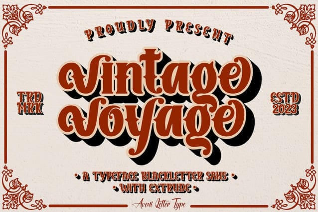 Vintage Voyage Font, I was born with a display font but still have a serif style and very neat kerning. Vintage Voyage font has a font family that Bold can be used as a regular outline font and comes with Extruded. This font can be used in many projects such as product branding, apparel branding, logotypes, wedding invitations, store branding, posters, merchandise, headers, and so much more!