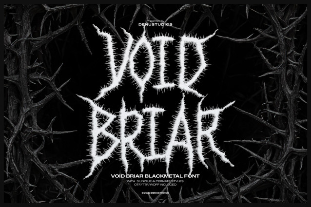 Void Briar Font | Black Metal Font, from Denustudios, suitable for any projects such as: logos, branding projects, homeware designs, product packaging, mugs, quotes, posters, shopping bags, t-shirts, book covers, name card, invitation cards, greeting cards, label, photography, watermark, special events, and all your other lovely projects that need a Black Metal taste.