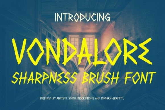 Vondalore Font is a bold and expressive display brush font that captures the raw energy of sharp, rigid strokes inspired by street graffiti culture and the primitive inscriptions of the stone age. This font blends rebellious urban expression with ancient, rough carving aesthetics—resulting in a typeface that feels wild, free, youthful, and full of struggle.