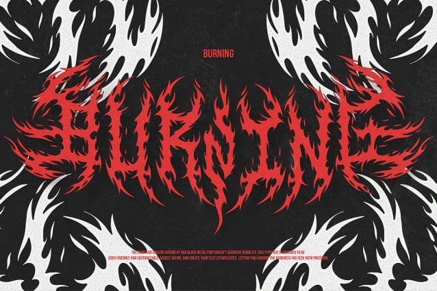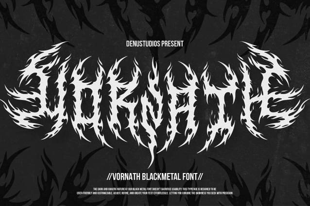 Vornath Black Metal Font, from Denustudios, suitable for any projects such as: logos, branding projects, homeware designs, product packaging, mugs, quotes, posters, shopping bags, t-shirts, book covers, name card, invitation cards, greeting cards, label, photography, watermark, special events, and all your other lovely projects that need a Black Metal Font taste.