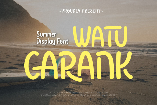 Watu Carank Font, a cheerful display summer font that captures the warmth and vibrance of the tropical season. With its playful curves, breezy shapes, and relaxed personality, Watu Carank is perfect for everything from summer event posters, beach party flyers, travel blogs, to juice bar branding and vibrant product packaging.
