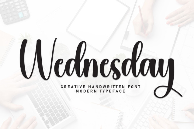 Wednesday Handcrafted Font A popular and professional script font. Modern and elegant, this typeface is made of beautiful creative strokes.This font is perfect for your creative ideas, both formal and informal. It has a modern style with a touch of creative ideas that is very suitable to be applied anywhere that requires creative ideas such as invitation cards,letterheads, website logos, social media, banners, advertisements, brochures, packaging products, leather products, and any product that requires writing.