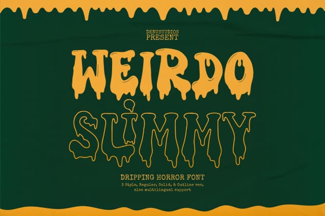Weirdo Slimmy font is made for personal use. Get the full version of the fonts if you want to use it for commercial purposes by purchasing the licenses here: https://denustudios.com/weirdo-slimmy-dripping-horror-font/