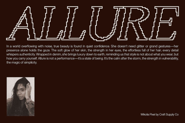 Wikolia Pixel Font – Minimalism with Confident Precision: Modern Serif with Pixel Contrast Professional and Stylish Expression This is a modern serif font that balances minimalism with confidence. Its elegant serif structure combined with contrast shapes communicates professionalism, making it a font that feels assured and impactful in any context. Pixel Style for Sharp Modern Edge The defining feature of this font is its pixel-inspired detailing. This digital influence adds a crisp and sharp edge to the design, infusing modernity into its classic serif foundation. The result is a font that feels both timeless and contemporary, bridging tradition with innovation. Confidence Through Contrast Shapes By incorporating contrast in its letterforms, projects a sense of self-confidence and authority. The strong shapes and refined proportions provide visual strength, while the pixel texture enhances its unique character. Versatile for Editorial and Branding Projects Perfectly suited for editorial spreads, branding identities, or creative projects, this font adapts to both professional and artistic needs. Whether in logos, titles, or layouts, it offers a striking blend of clarity, elegance, and digital precision. Download Type Speciment: What you get : – Wikolia Pixel Regular – Wikolia Pixel Outline Features : – Uppercase and lowercase characters – Numerals and Punctuation (OpenType Standard) – Accents (Supports Multilingual Characters) – PUA Encoding You can use this typeface without needing any specialized software. If you have any inquiries or need assistance, please feel free to contact us. We appreciate your support in enhancing your creative projects! Best regards, Craft Supply Co.