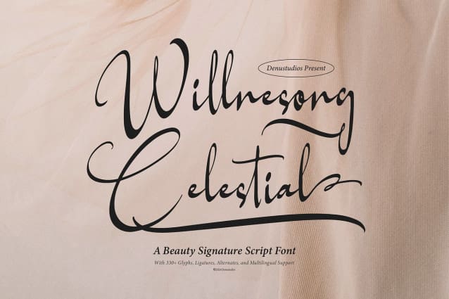 Willnesong Celestial Font | Beauty Signature Script, from Denustudios, suitable for any projects such as: logos, branding projects, homeware designs, product packaging, mugs, quotes, posters, shopping bags, t-shirts, book covers, name card, invitation cards, greeting cards, label, photography, watermark, special events, and all your other lovely projects that need a Beauty Signature Script taste.