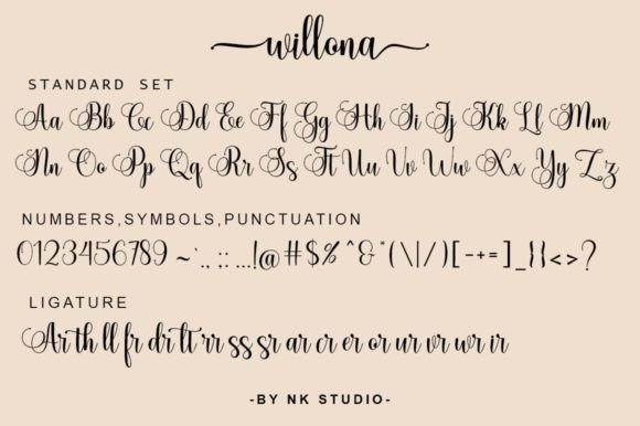 Willona Calligraphy Font is a subtle and elegant script font. This font has a lovely touch of character, perfect for a variety of designs. The Willona features varied baselines, unique smooth lines, and stunning alternatives. Add to your most creative ideas and see how to make art!