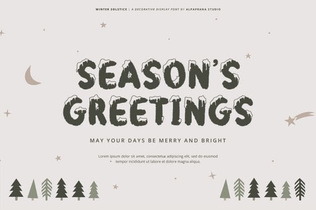 Winter Solstice Font is a decorative display display font with cute and modern style. It will be perfectly used for Branding, Logo Design, Lettering, Logotype, Clothing, Poster, magazine, packaging, posters, shopping bags, t-shirts, book covers, photography, special events and other design project.