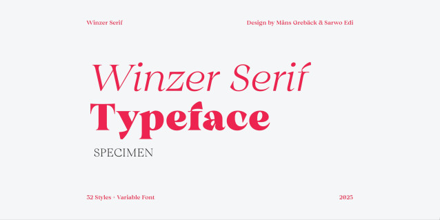 Designed by Mans Greback in collaboration with Sarwo Edi, Winzer Serif reflects craftsmanship and versatility at every level. Its 32 carefully constructed styles, along with a variable font, offer maximum flexibility across any format or platform.