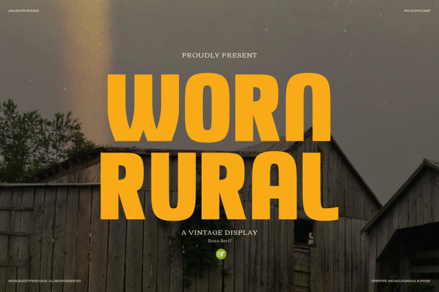 Worn Rural Font | Vintage Display, from Gracetypestudio, suitable for any projects such as: logos, branding projects, homeware designs, product packaging, mugs, quotes, posters, shopping bags, t-shirts, book covers, name card, invitation cards, greeting cards, label, photography, watermark, special events, and all your other lovely projects that need a Vintage taste.