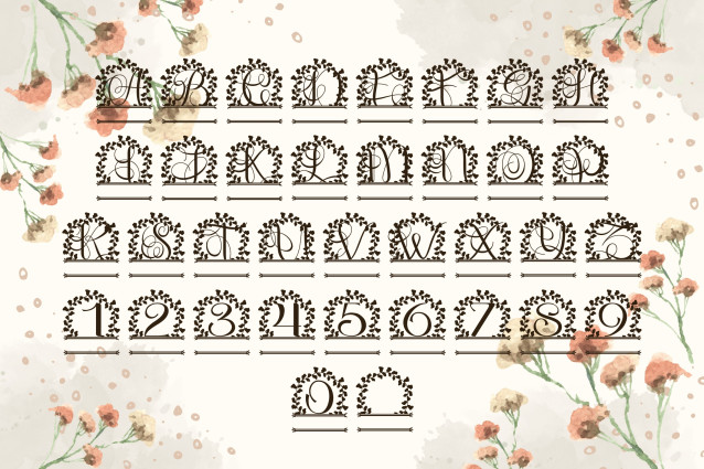 Wreathory Split Font is a charming serif split monogram font adorned with delicate wreath illustrations. Each uppercase letter is split horizontally, creating a space for custom names, dates, or initials—ideal for weddings, personalized gifts, or seasonal crafts. The included wreath elements bring a handcrafted botanical elegance that pairs beautifully with rustic or romantic design themes.