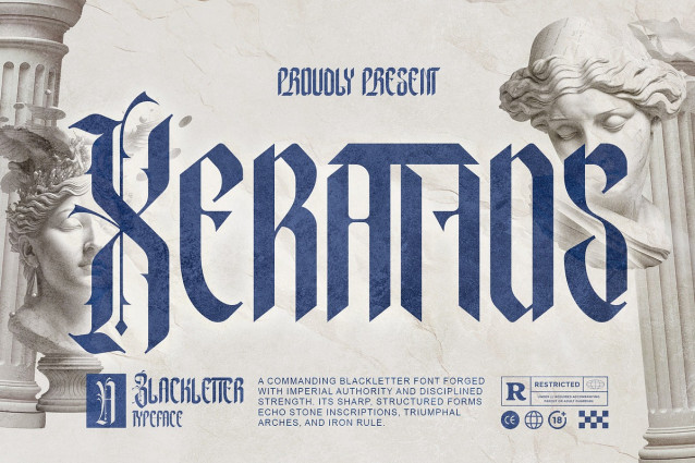 Xerathos Font A monument in letterform. Xerathos emerges from the grandeur of imperial blackletter tradition—disciplined, commanding, and architecturally precise. Inspired by stone inscriptions, triumphal arches, and the solemn authority of classical empires, Xerathos channels structured power into every vertical stroke and sharpened serif. It does not whisper elegance—it declares dominance. Forged with bold geometry and disciplined rhythm, Xerathos balances gothic heritage with modern refinement. Its sharp angles, balanced proportions, and carved-like terminals create a presence that feels etched into marble rather than laid upon a page. Each glyph carries the weight of ceremony and conquest, transforming simple words into emblems of authority and prestige. Perfect for luxury branding, editorial mastheads, high-end packaging, cinematic titles, album covers, tattoo lettering, and commanding logos, Xerathos delivers a bold blackletter aesthetic without sacrificing clarity or sophistication. With an extensive glyph set and multilingual support, it provides both artistic depth and professional versatility. Xerathos is not ornamental excess—it is structured power. Where discipline meets dominance. Where typography becomes legacy.
