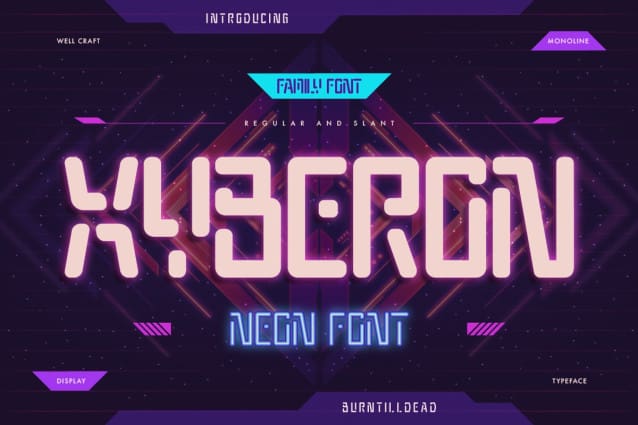 Xyberon Display Font, a monoline font that show sophisticated futuristic and modern. This font has regular and slant style. Where sleek design meet futuristic flair, transforming your creations into visions of tomorrow. Xyberon is a futuristic neon and perfectly stands out in branding, headlines and artistic projects.