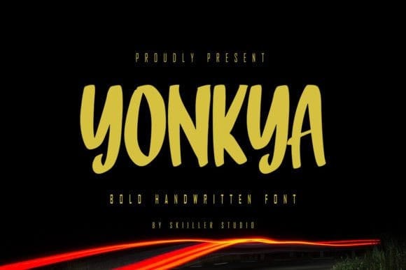 Yonkya Font is a modern and brushed handwritten font, crafted to give your headlines and logotype projects a stylish touch. This font reads as strong, confident, and dynamic and can add tons of urban character to your designs.