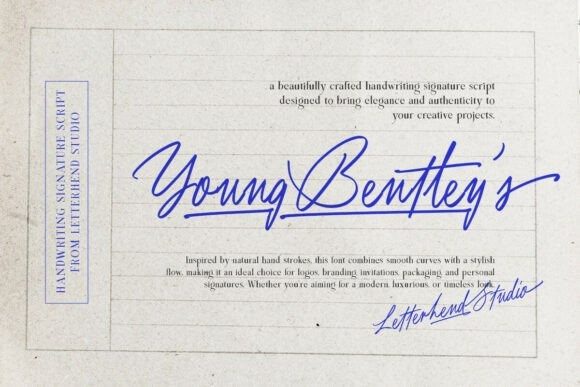 Young Bentley’s Font is a stylish handwritten signature font with smooth, natural curves and an effortless flow. It captures the look of genuine pen strokes, bringing elegance and modern charm to your designs. Perfect for logos, branding, invitations, packaging, and anything that needs a refined handwritten touch, this font adds a sense of class and authenticity without trying too hard.