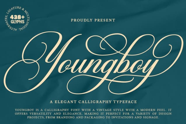 Youngboy Font is a calligraphy font with a vintage style with a modern feel.it offers versatility and elegance,Making it perfect for a variety of design projects, from branding and packaging to invitation and signage. Youngboy Font is a calligraphy script font that comes with very beautiful changing characters, a kind of classic decorative copper script with a modern touch, designed with high detail to bring stylish elegance.