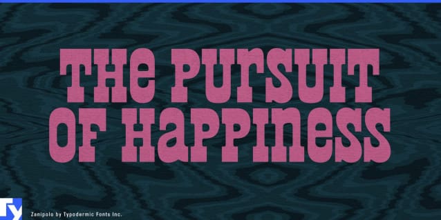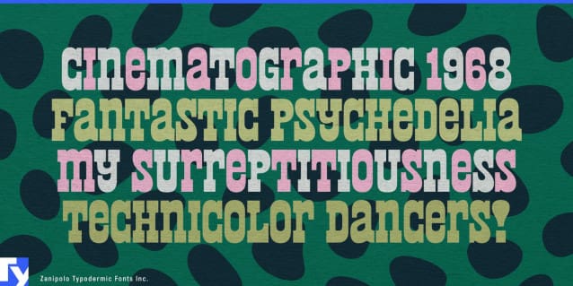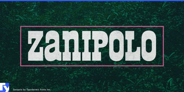 Zanipolo Font, a distinctive typeface from Typodermic Fonts that channels the vibrant essence of the 1960s with a modern twist. This all-caps, inverse-slab serif unicase typeface draws its inspiration from the obscure Italienne from Fonderie Typographique Française, a revival of an early 19th century font that saw a resurgence during the psychedelic era.