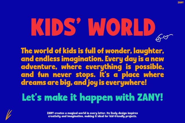 If you’re looking for a way to infuse your designs with joy, creativity, and bold character, Kids Font Zany is your go-to choice. Its engaging style is sure to capture attention and leave a lasting impression. So why settle for ordinary fonts when you can bring your projects to life with Zany? Try it today and let your creativity run wild!