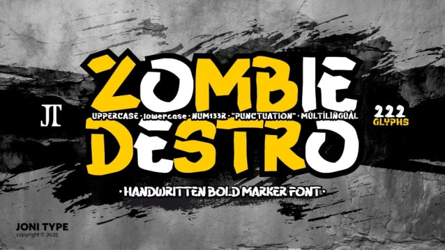 Zombie Destro Font is a fearless handwritten bold marker font that brings raw energy and rebellious vibes to your designs. With its sharp edges, bold strokes, and street-style attitude, this font is perfect for posters, album covers, urban branding, social media graphics, and eye-catching titles.