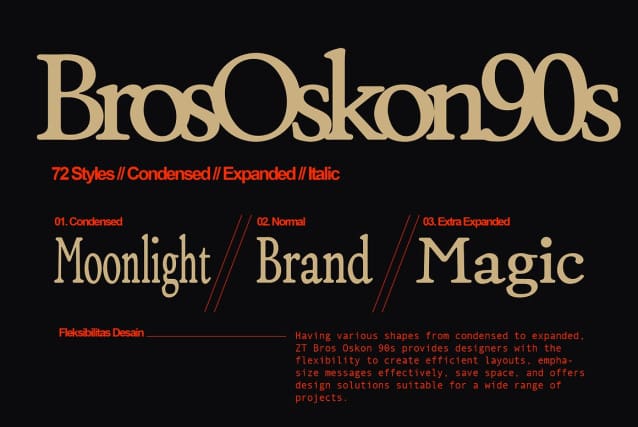ZT Bros Oskon 90s Font Family is a captivating typographic creation that seamlessly blends the aesthetic charm of the 1990s retro era with a modern touch. With unmatched serif elegance and a unique 90s style, this font offers 72 variations, including sharp condensed forms, graceful expansions, and captivating italic styles.
